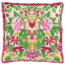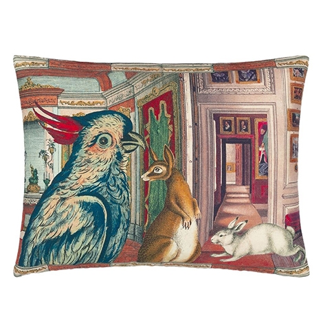 設計師John Derian經典的蝶古巴特風格印花棉麻抱枕,鸚鵡、袋鼠與兔子置身於圖書館中。尺寸60x45cm。共1色。
