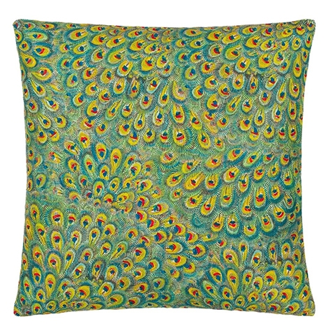帶有John Derian設計師風格的孔雀印花棉麻抱枕,反面搭配滿版羽毛圖案。尺寸50x50cm。共1色。