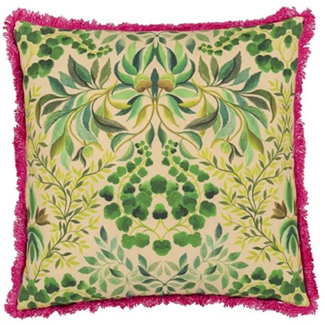 抱枕正面以刺繡展現豐富的花卉、樹葉與蝴蝶;抱枕背面為印花棉布,側邊帶有搶眼的流蘇飾邊。尺寸50x50cm。共2色。