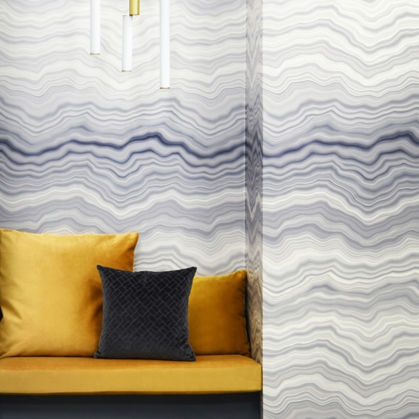 波紋光學效果受到拋光大理石紋理表面的啟發。兩種藍色調以珍珠母貝的光澤強調圖案的紋理,展現清晰與自然的優雅啞光對比。