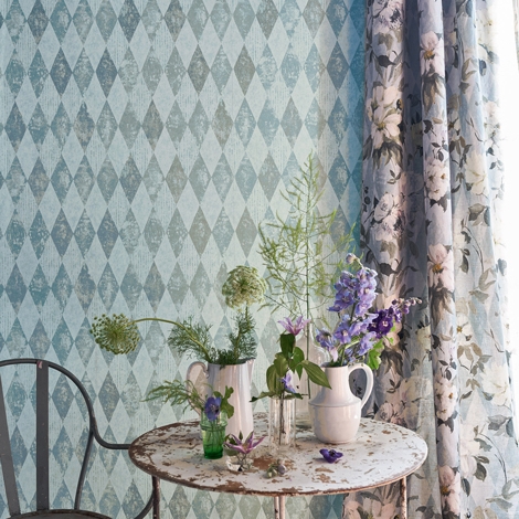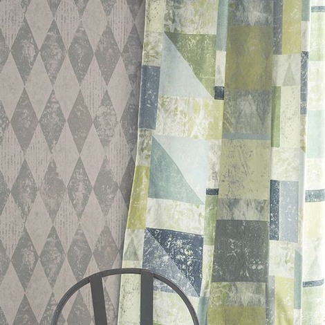 充滿斑駁紋理的菱格圖騰,色調柔和中性,凹版印刷於不織布底,可清洗、容易安裝。