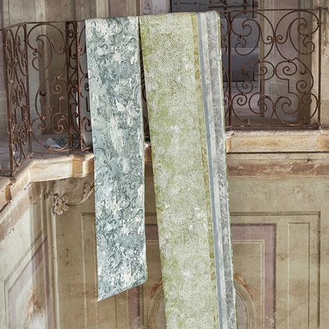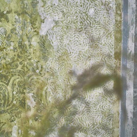 重新詮釋威尼斯的美麗宮殿,運用開心果綠和岩板灰,勾勒出古董壁畫紋路。淡淡的大馬士革設計以石灰輕輕覆蓋,印製在厚實的不織布底,容易安裝。