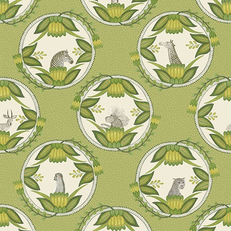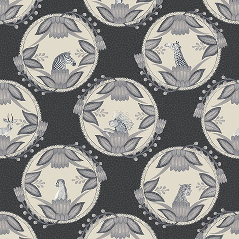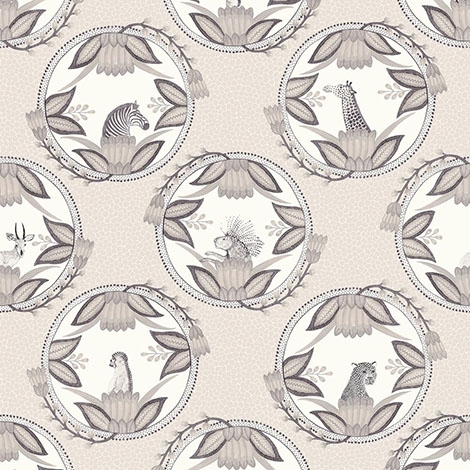 最初為送給Ardmore朋友的結婚禮物而設計的盤子圖案,以淡淡的長頸鹿斑點為背景,上有斑馬、花豹等動物。適合作為壁紙使用。尺寸68.5x1005cm。共4色。