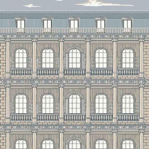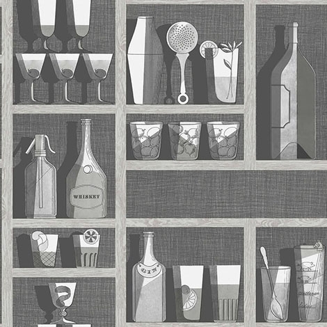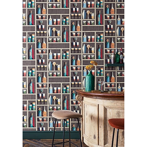 源自Piero Fornasetti在1950年代創作的Oggetti Cocktail冰桶設計,中世紀風格的調酒容器和玻璃器皿使用多種配色,與原始草圖一致。適合作為壁紙使用。尺寸68.5x1000cm。共3色。