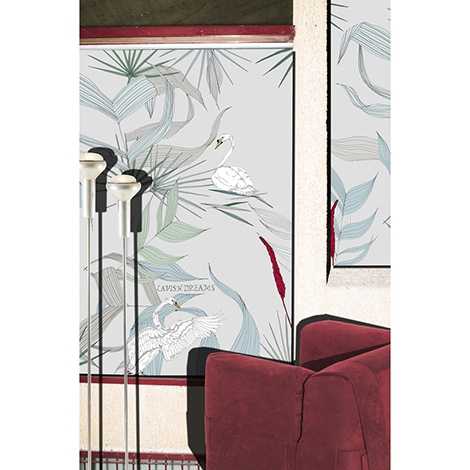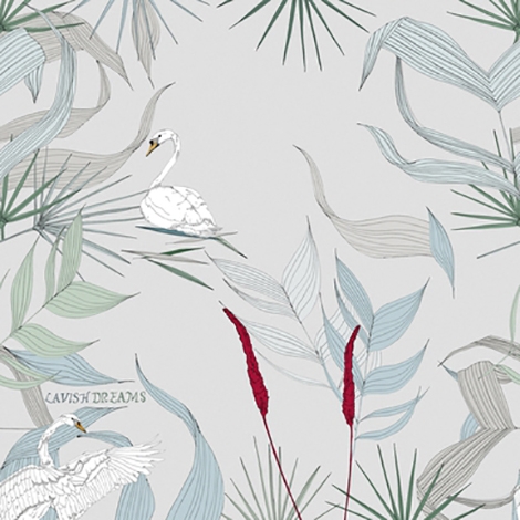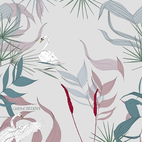 優雅的天鵝悠游於水面或奮力地展開翅膀,周圍是受到風的吹拂而搖擺的植物。適合作為壁紙使用。共2色。