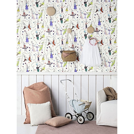 由11歲小孩Charlotte所繪,被紫藤、五顏六色的雛菊和蝴蝶環繞的兔子家族。尺寸寬137cm。適合作為壁紙使用。共1色。