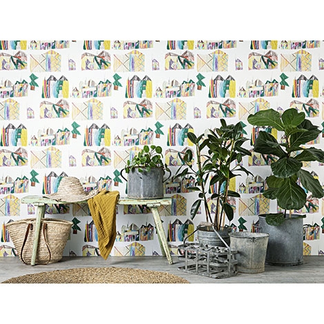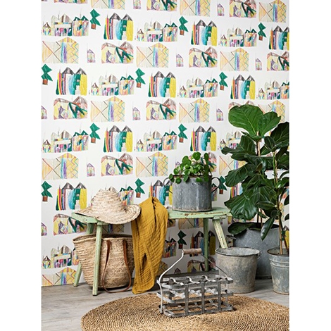 由9歲小孩Patricio所繪,色彩繽紛的房屋、樹木與冒煙的煙囪,還有一個向我們招手的小小人物都在這個幻想中的城市。尺寸寬134cm。適合作為壁紙使用。共1色。