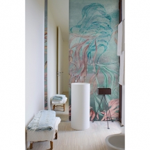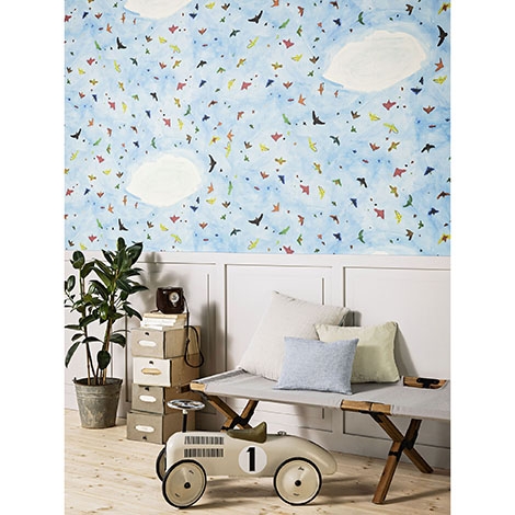 由8歲小孩Iris所繪,雲朵和各種顏色的鳥在藍天中飛翔。尺寸寬136cm。適合作為壁紙使用。共1色。