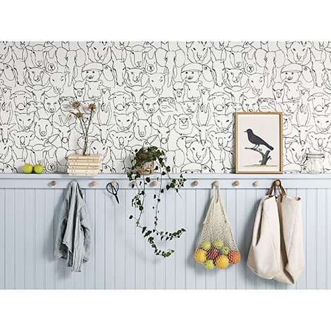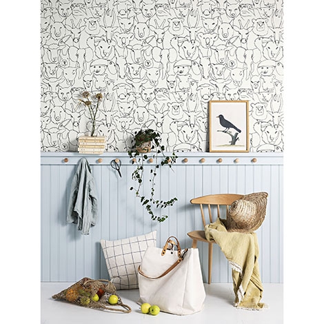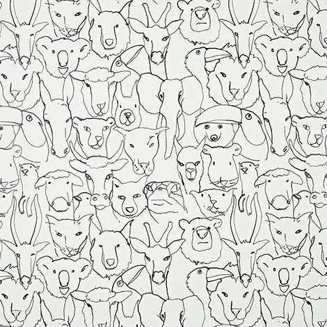 大嘴鳥、熊、蛇、倉鼠、綿羊、羊駝、大象與馬等動物以線條描繪。尺寸寬136cm。適合作為壁紙使用。共1色。