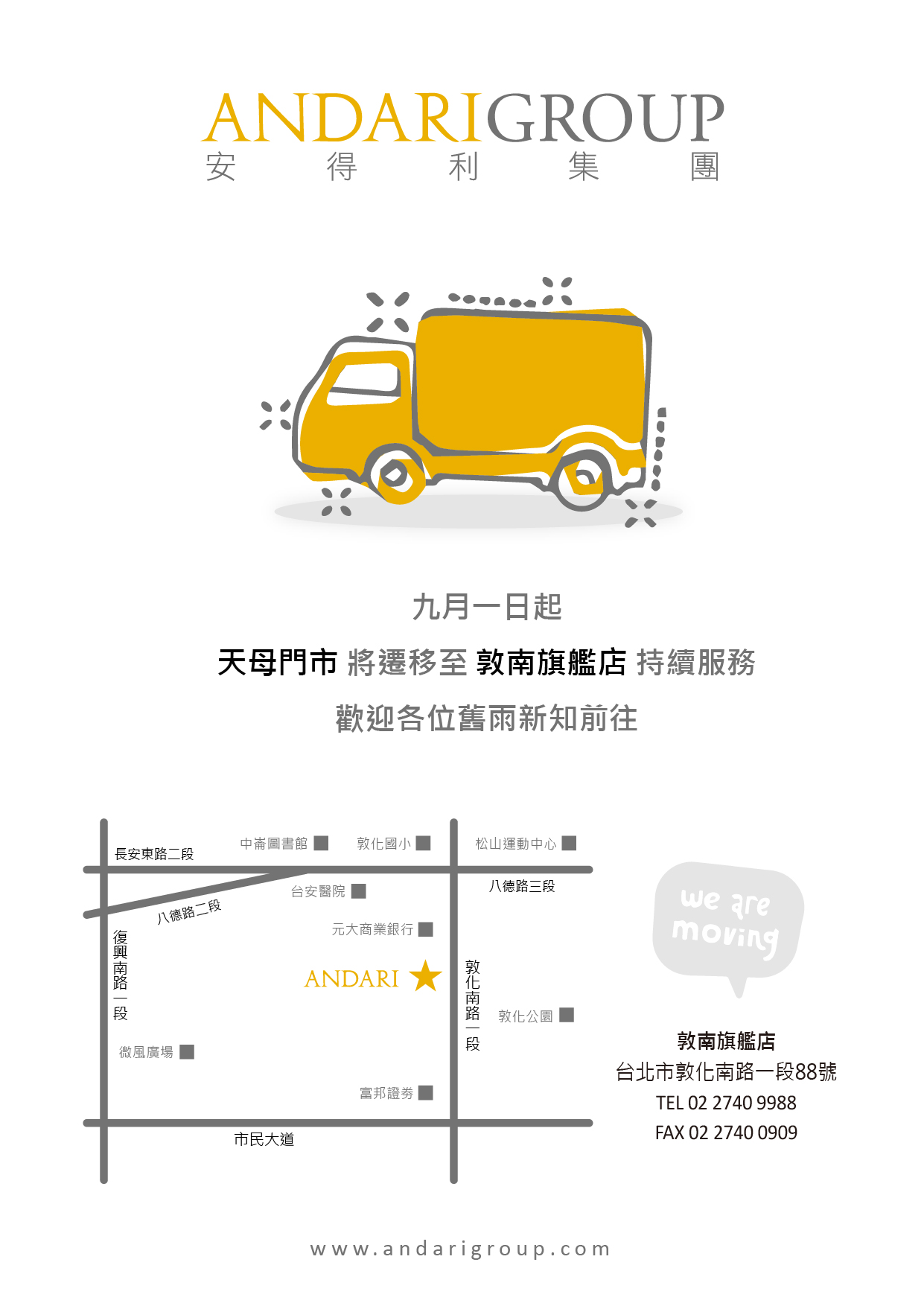 2021.09.01 起,安得利天母門市將遷移至敦南旗艦店,