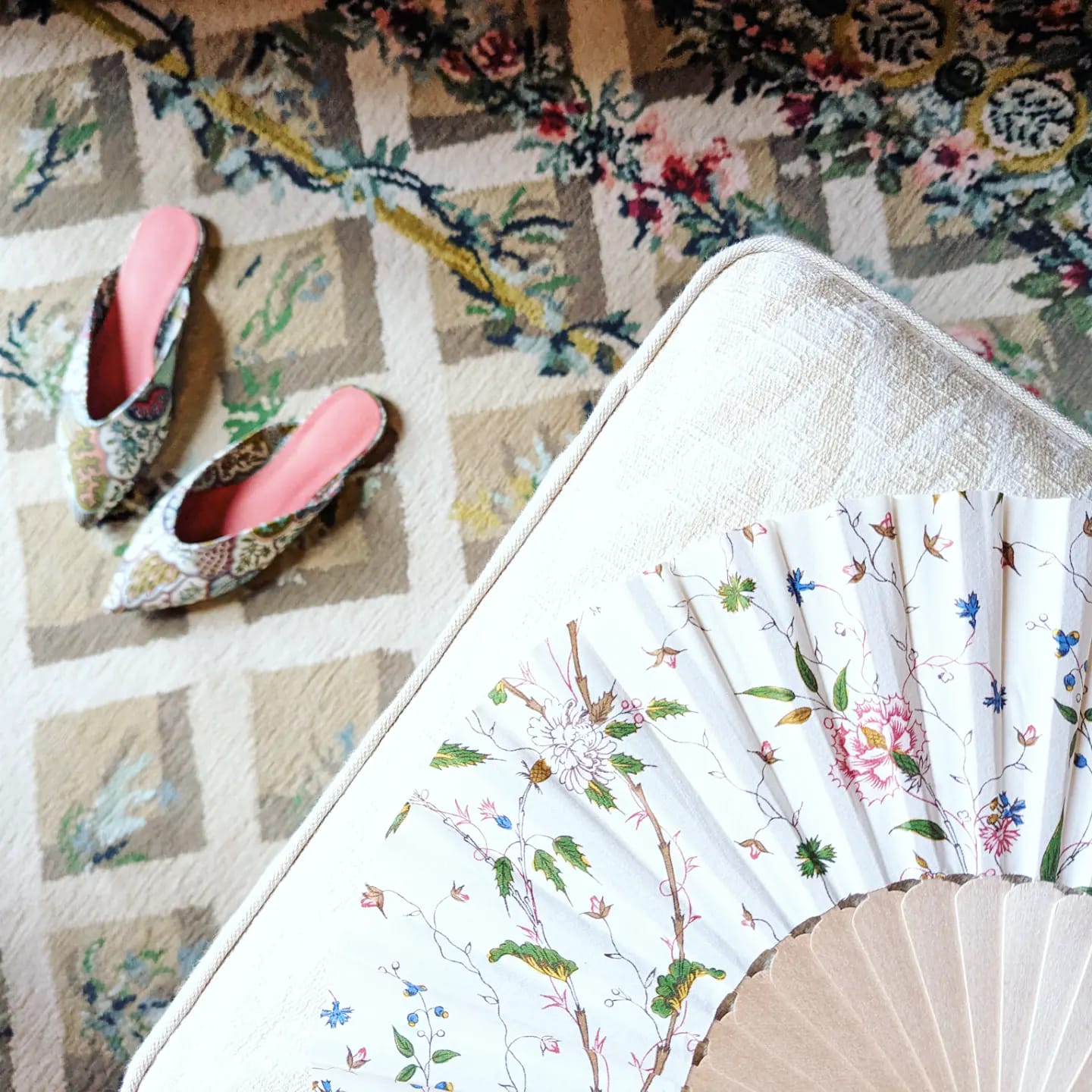 屏風上披掛的睡袍為十八世紀後期受路易十六風格影響的大型玫瑰圖案 Cerizay,印製在精梳棉底。房間則以 Scenes de Campagne 田野風光的朱伊紋 (toile de Jouy) 作為窗簾與壁布。這是十八世紀尾聲最典型的代表,原始的布料推論為公爵夫人的一床被子,以木板印刷描繪氣球飛船,像是入睡時夢中的旅程。
