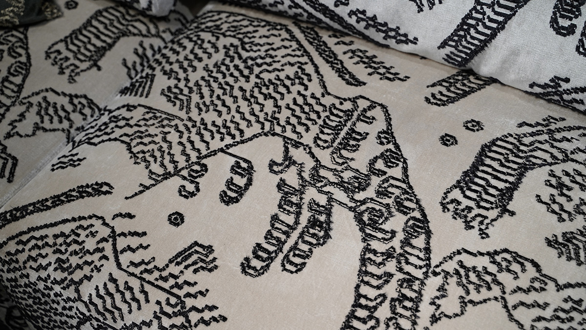 此款緹花天鵝絨面料靈感源自西藏地毯;抽象的老虎圖樣賦予人神秘的想像,映射出每個人內心而加以詮釋,無論抱枕或家具,都能呈現出精緻工藝及強烈視覺特色,展現義大利工藝作品難以忽視的強烈氛圍。