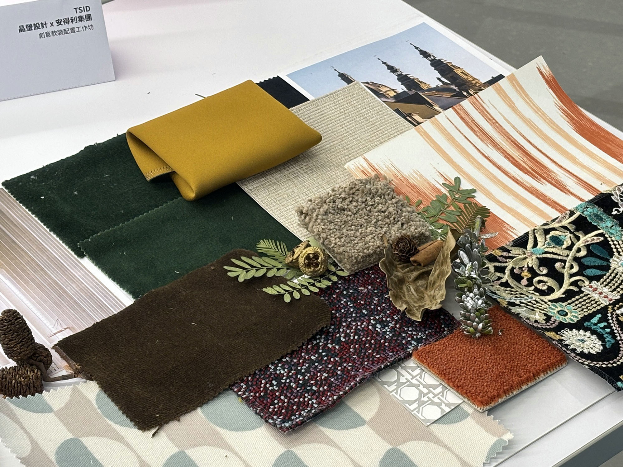 安得利很榮幸與 TSID 台灣室內空間設計學會、晶瑩設計合作【創意軟裝配置工作坊】。三十位來自全台空間設計相關科系(台南應用科技大學、國立鳳山商工、高雄三民家商、高雄中正高工、國立員林農工、台中教育大學)的學生、與室內設計師一同共襄盛舉、報名參加。靈感材料桌有著來自安得利代理的軟裝材料。法國傢飾品牌 Lelierve, Pierre Frey, 美國傢飾品牌 Pollack, 泰國傢飾品牌 Jim Thompson, 瑞士家飾品牌 The Sign, 美國方塊地毯品牌 Interface, 義大利皮磚品牌 StudioArt 等,以及花草木石等自然元素,讓參加者發揮創意,恣意搭配。評審團隊左至右:從雅設計暨南應大老師 賴玫瑰小姐、禾禩設計 陳祐帆小姐、晶瑩設計暨南應大老師 譚朝玲小姐、 廣角度設計暨南應大老師 許瑞燕小姐、南應大老師 黃麗美小姐。 在 2024 TSID 競圖大賽期間,我們在舒適的台南市立圖書館 新總館,透過影像與家飾布樣、壁紙、地毯做創意互動,體驗軟裝設計與材料搭配,塑造理想空間。